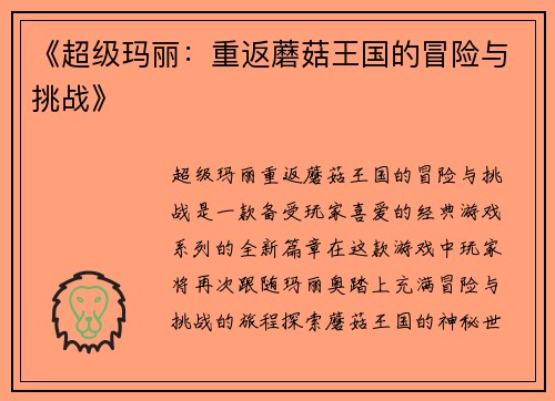 《超级玛丽:重返蘑菇王国的冒险与挑战》