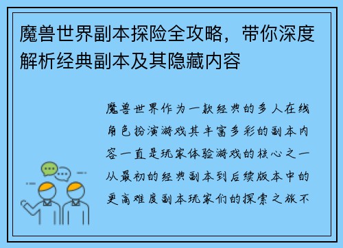 魔兽世界副本探险全攻略,带你深度解析经典副本及其隐藏内容